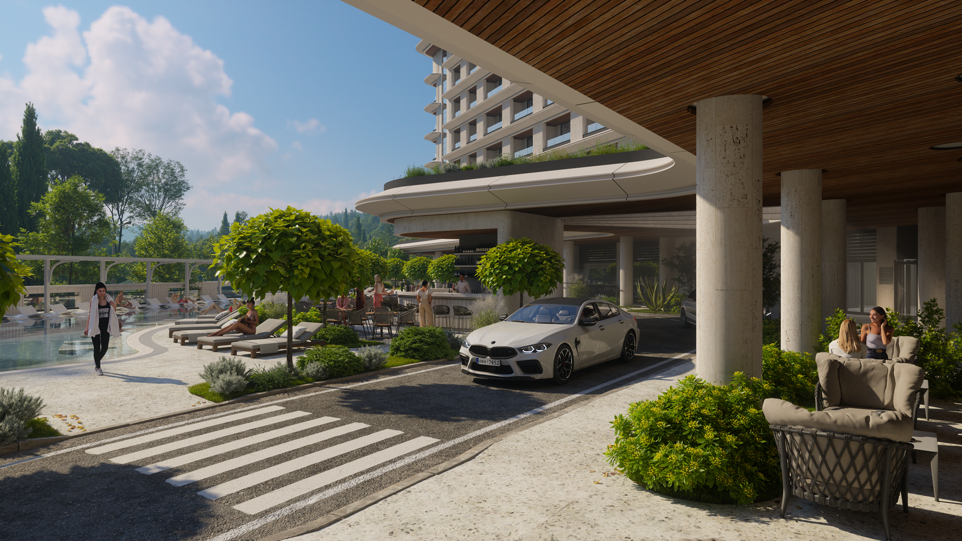 Среди преимуществ комплекса: 8-этажное здание в современном стиле с фасадом из натурального травертина и архитектурной подсветкой, большой подогреваемый бассейн с детской аквазоной и джакузи, ресторан à la carte, бар у бассейна, полноценный SPA & Wellness-центр, детская площадка, зона анимации, лаундж-террасы и ландшафтный дизайн территории.